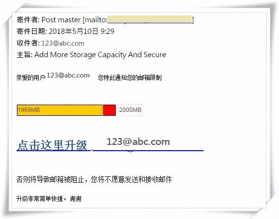 2.【邮箱问题】通常以提醒“邮箱异常”、“升级容量”、“安全警告”、“升级邮箱配置”等形式出现。